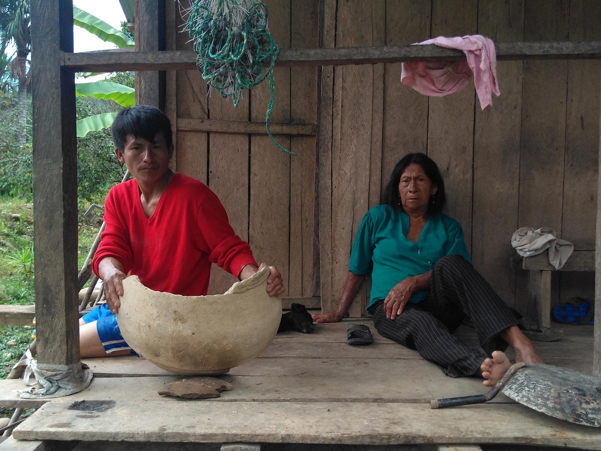 Carlos Tendetza-Antún and his mother, with an ancient ceramic pot encountered in their garden.