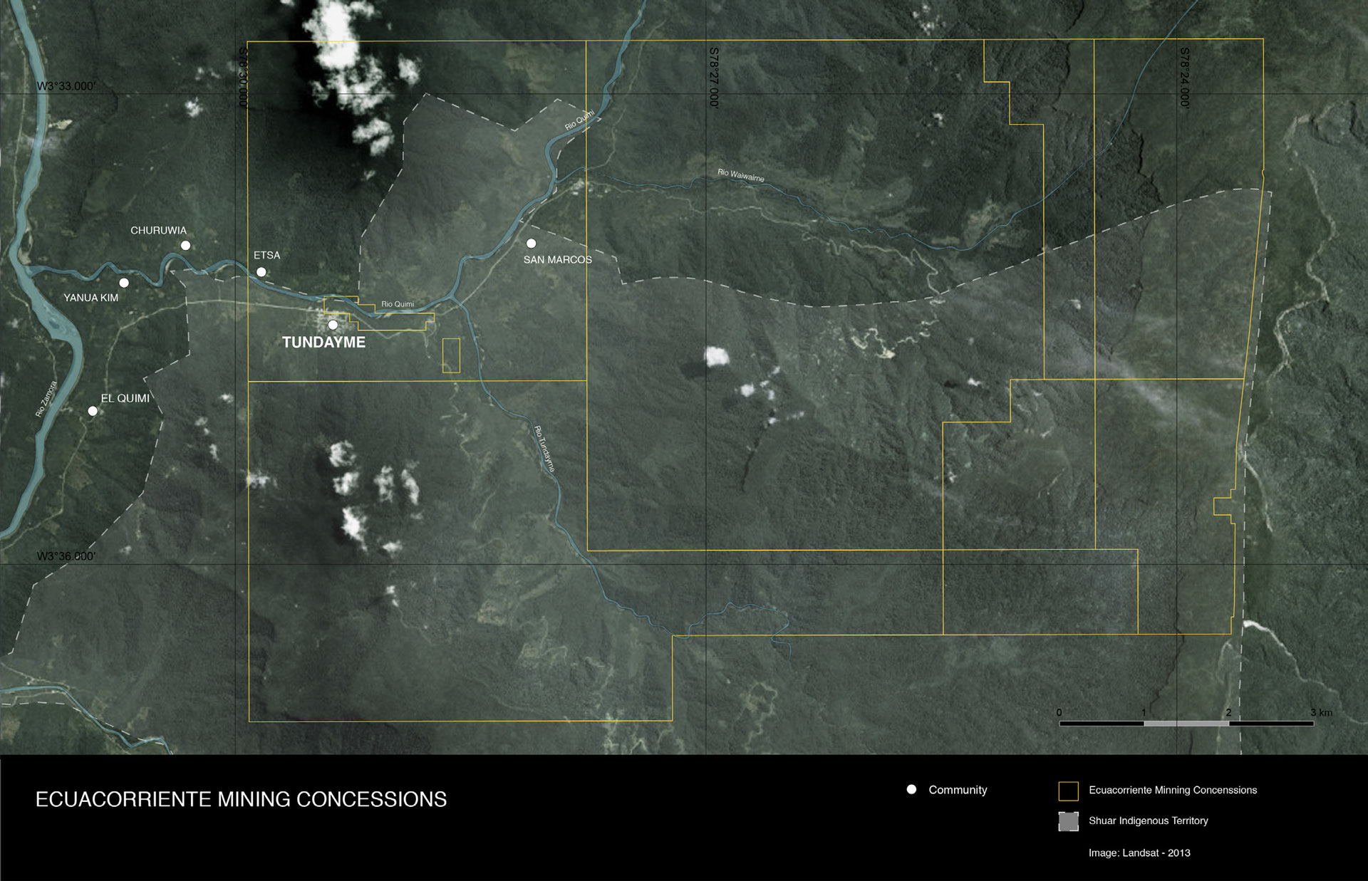The Mirador project holds a concession of 2.994 hectares that occupies the entire area between the Tundayme and the Wawayme rivers. The Chinese–consortium led by Ecuacorriente also acquired rights to explore all other adjacent concessions to Mirador, being effectively in control of a territory larger than the urban area of the city of Barcelona. These concessions superimpose shuar territories and ecological protection areas.