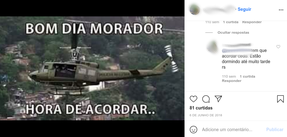 The same takes place with the posts and comments in Facebook public pages and groups, where fear and concern with families and with the children who are in school are also recurrent. A good part of such posts were made during the operation, expressing fear, revolt and concern.
