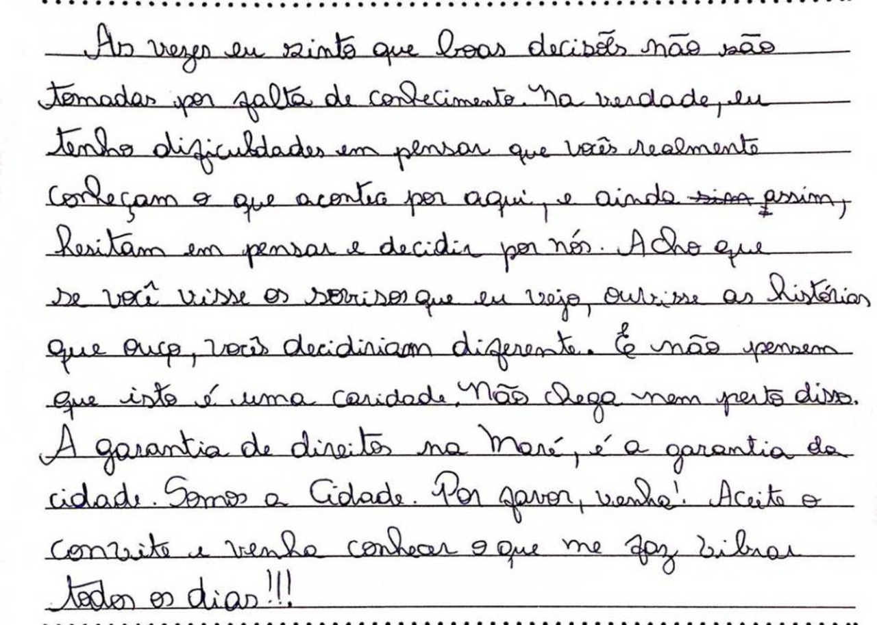 In 2019, the Judiciary suspended the Public Civil Suit that established protocols for the action of police forces in Maré. After this and other episode of State violence in the Complexo da Maré area, the organisation Redes da Maré carried out an action to render visible the terror experienced by dwellers and workers living in the community. More than one thousand letters written by Maré's dwellers and workers were delivered to the Rio de Janeiro Justice Tribunal (TJ-RJ). In them, the dwellers, among them many children, related by means of drawings and text the horrors and the violations taking place as a consequence of police operations. These testimonials were annexed to the process and they served as a ground to demand the re-establishment of minimum protocols for police actions in the area, gained with the Public Civil Suit.
